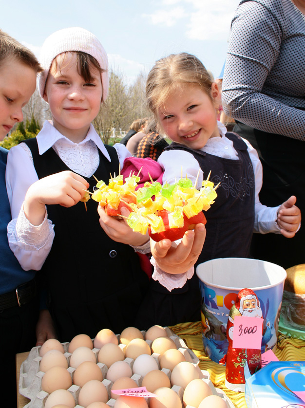 Великий и радостный праздник святой Пасхи встретили православные христиане в это воскресенье. Согласно церковным канонам, празднования торжества будут продолжаться сорок дней, в течение которых принято «христосоваться», ходить друг другу в гости, дарить крашеные яйца и куличи. А вот в агрогородке Кадино есть еще одна хорошая пасхальная традиция: проводить в первую праздничную неделю благотворительную школьную ярмарку.