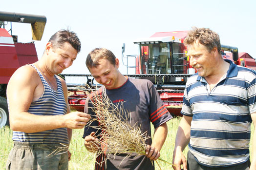 Уже издали замечаем красные «гомсельмашевские» комбайны, которые бороздят в рапсовом «море». Останавливаемся и дальше — уже пешком. В поле жарко, пыльно. Солнце припекает изрядно. Комбайнеры заметили приближающихся людей и остановили машины.
