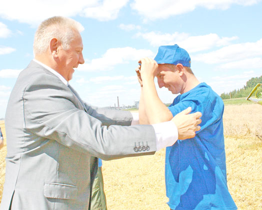 Губернатар уручыў лідэрам жніва Ганаровыя граматы Камітэта па сельскай гаспадарцы і харчаванню аблвыканкама, дыпломы за самаадданую працу, кепкі і майкі з сімволікай. Жонкам камбайнераў, якія забяспечваюць надзейны тыл, П.М.Руднік перадаў харчовыя пакеты ААТ “Бабушкина крынка” з пажаданнямі сямейнага шчасця і дабрабыту.