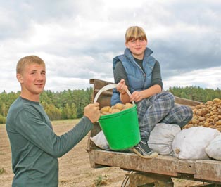 А в поле Марина и Сережка собирают картошку