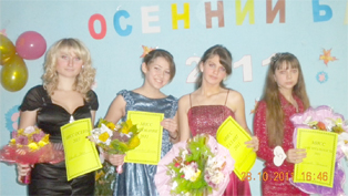 На этой по-осеннему украшенной сцене волновались, выступали самые умные, самые красивые, самые романтичные девочки из 9-11 классов. Оказалось, что всё умеют наши юные участницы конкурса: и себя преподнести, и стихи об осени (и о любви!) прочитать. И петь, и танцевать! А как же, ведь надо соответствовать волшебнице-осени! А благодарные зрители помогали своим любимицам, радовались за них. Но только самая-самая -самая получила такой почётный и желанный титул – «Мисс Осень -2011». Ею стала ученица 11 класса Ольга Ковалева. Приз зрительских симпатий и титул «Мисс Оригинальность» был вручён ученице 9 класса Татьяне Шачневой. Титул «Мисс Очарование» получила Арина Радюкевич, ученица 11 класса. А звание «Мисс Талант» достался ученице 9 класса Александре Шишкуновой.