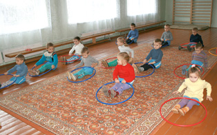 С удовольствием воспитанники детсада приходят в спортивный зал. Для занятий физкультурой здесь, наряду с обычным спортивным инвентарем, используется так называемое нестандартное оборудование, изготовленное руками педагогов. Все это, безусловно, привлекает ребят, заинтересовывает их. И даже малыши умеют ходить строем, прыгать, выполнять упражнения с обручами, мячами…