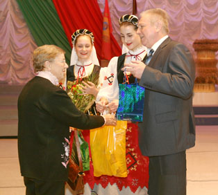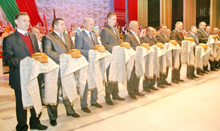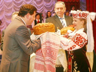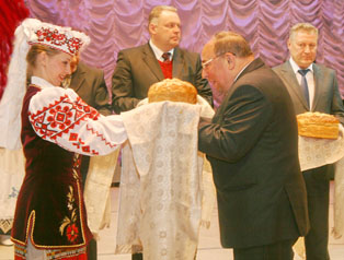 П.М.Руднику вручен хлебный каравай, как результат плодотворного труда хлеборобов и тружеников АПК. Праздничные душистые караваи из урожая 2011 года вручены председателю райисполкома и всем руководителям хозяйств, которые были приглашены на сцену.