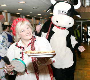 В фойе была широко развернута торговля, налажены выставки декоративно-прикладного творчества. Здесь же, на импровизированной сцене, участники художественной самодеятельности сельских Домов культуры и детских школ искусств показали народный обряд «Масленица».