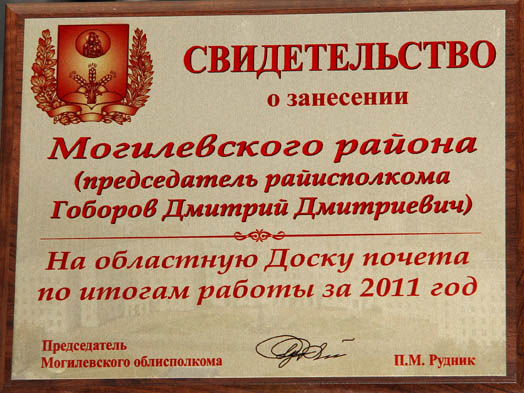 Председателю Могилевского районного исполнительного комитета Д.Д.Гоборову вручен сертификат о занесении на областную Доску почета.