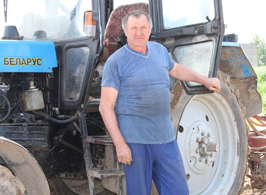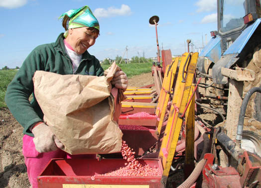 В поле, куда мы приехали, трудился опытный механизатор Адам Михайлович Шулякевич. Рабочий день его начинается в семь часов утра, а к окончанию смены он успевает засеять около двадцати гектаров. Помощь ему оказывает полевод Тамара Евдокимовна Елинская — она засыпает в бункеры сеялки протравленные семена кукурузы.