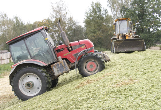 Вопросы заготовки кукурузного силоса решаются в хозяйстве комплексно. Работа не прерывается ни на минуту: стоит отъехать одному трактору с прицепом, его место тут же занимает другой — обязательные условия заготовки качественного силоса — быстрое заполнение хранилища.