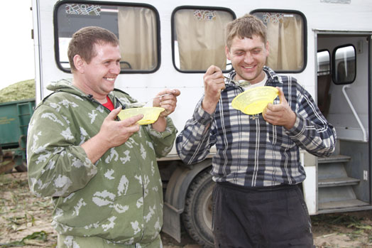 В полдень глохнут моторы на полях — привозят обед. Тех, кто трудится на уборке, кормят два раза в день. Повара в местной столовой отменные, так что благодарности механизаторов — и за то, что пища вкусно приготовлена, и за то, что вовремя ее доставили.