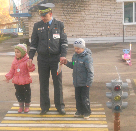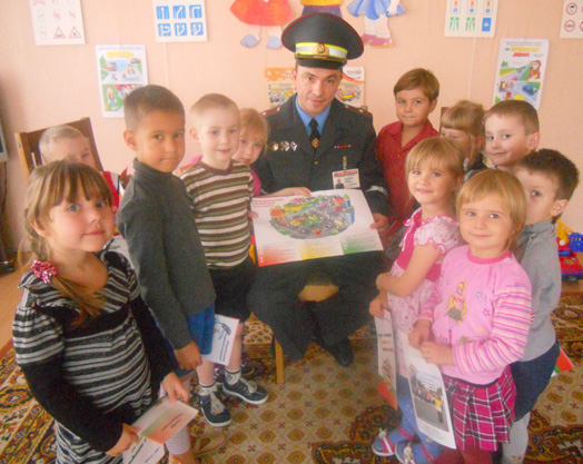 Особый восторг и интерес у детсадовцев вызвало выступление начальника отделения ГАИ Могилевского РОВД С.П.Казаченко. Он рассказал об опасностях, которые могут возникнуть на дорогах, познакомил с дорожными знаками, а также вручил памятки, разработанные специально для малышей, и светоотражающие элементы.