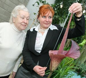 В экспозиционной оранжерее зацвел трупный цветок, или аморфофаллус. «Трупным его называет из-за запаха, который напоминает запах гнилого мяса, его еще называют лилией Вуду, дьявольским языком, змеиной пальмой», — пояснили в ЦБС. Необычный цветок из семейства ароидных родом из тропических лесов и саванн Индии, Китая, Вьетнама. Аморфофаллус культивируют в Китае, его клубни применяют как диетический продукт для снижения уровня холестерина и сахара в крови. В медицине эти клубни используются как сырье для изготовления диабетических продуктов.