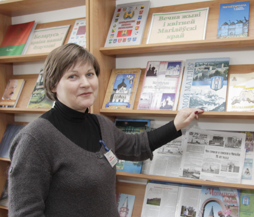 Увлеченная своей профессией, регулярно проводит для посетителей викторины, тематические беседы, оформляет книжные стенды. Вот и сейчас на стеллажах привлекают внимание выставки, посвященные 75-летию со дня образования Могилевской области: “Зямля, нам дадзеная лёсам”, “Вечна жыві і квітней, Магілёўскі край”, которые отражают яркие моменты прошлого и настоящего.