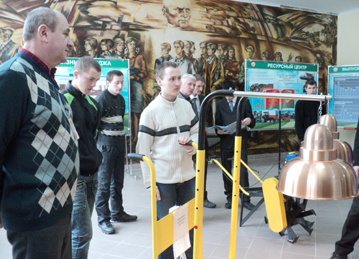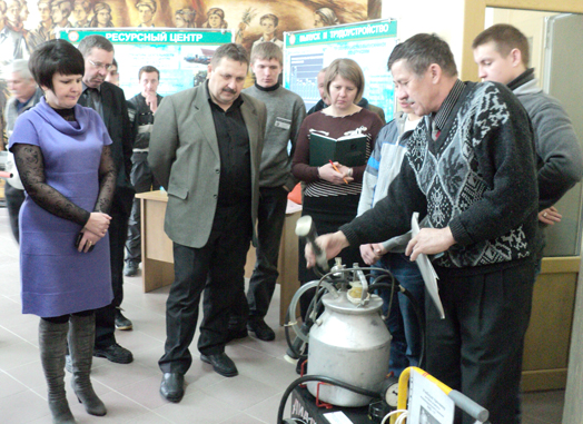 Мастер производственного обучения В.Ф. Невмержицкий продемонстрировал учебный тренажер — агрегат индивидуального доения. Учащиеся рассказали об эффективном использовании тренажера.