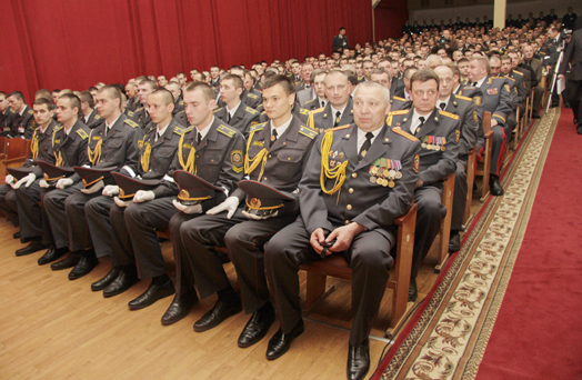 По доброй традиции в актовом зале собрались курсанты и преподаватели, сотрудники милиции, ветераны, выпускники разных лет со всех уголков бывшего Советского Союза. В этот праздничный день руководство в лице полковника милиции, начальника Могилевского высшего колледжа МВД РБ Геннадия Леонидовича Колесника и личный состав колледжа принимали заслуженные поздравления и подарки от гостей вечера.