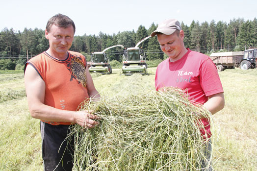 Вот оно — поле, где идет кропотливая работа по уборке первым укосом многолетних трав. Сейчас они — самые витаминные, содержат максимум перевариваемого протеина. Подсушенные валки из трав параллельными рядами уходят вдаль. По полю споро движутся зеленые «ягуары». На этих кормоуборочных комбайнах заняты самые лучшие механизаторы — Д.Д.Кононов и М.В.Кожемяко — активные участники всех полевых работ, люди ответственные, которые любят технику, берегут ее, постоянно поддерживают в исправном состоянии.