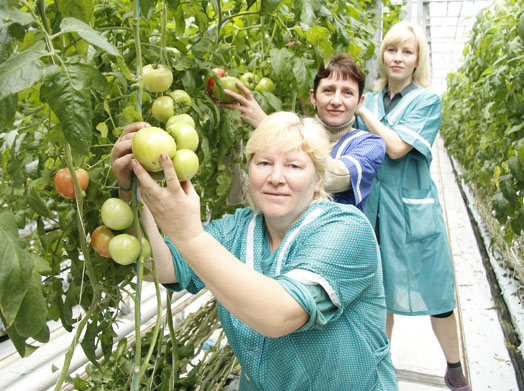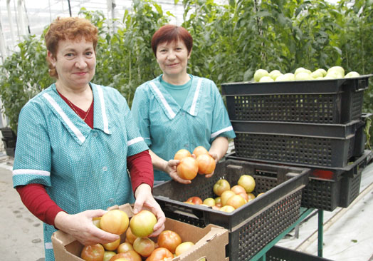 В теплицах агроторговой фирмы еще царит настоящее лето — внутри зеленеют томаты. «Растения — словно дети, огурец или томат нужно вовремя полить, подкормить, подвязать», — считают опытные овощеводы, одни из лучших в своем деле Лариса Крупенина и Любовь Тишковская.