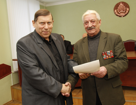 Заместитель председателя облсовета ветеранов Семён Капустин вручил нагрудный знак «Почетный ветеран» за многолетнюю активную работу в ветеранских организациях. Этого звания удостоены Н.Ф.Титович и С.С.Белоконь. Активисты удостоены грамот райсовета ветеранов.