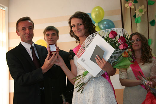 Аттестат особого образца и «золотую медаль» получила наша одноклассница Ольга Кудрявцева. Мы от души рады за нее и поздравляем с этой первой в жизни победой. Мама Оли, Елена Егоровна, в этот момент волновалась, наверное, как никто другой. От себя лично и от имени всех родителей она поблагодарила педагогический коллектив, поздравила выпускников. Трогательным было выступление и самой Оли, которая подготовила стихи и цветы для своей мамы.