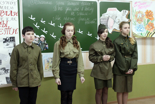 Классные руководители 7-х классов (кл.рук. Г.И.Антипенко, Л.В.Масленая) вместе с учащимися подготовили литературно-музыкальную композицию «Маленькие герои большой войны». Ребята вспоминали маленьких жертв Освенцима и Саласпилса, стойких маленьких блокадников Ленинграда, сынов полков, которые разделили тяготы боевых действий вместе со своими старшими товарищами. В каждом слове боль, в каждом слове нежность к детям, которые в одночасье стали взрослыми. Трогательно читали стихи Е.Романова, П.Каширина, Д.Волкова. В глазах и детей, и взрослых стояли слезы. Каждый сумел прочувствовать трагизм пережитого детьми войны и понять ценность каждой минуты мира. Ребята своими выступлениями еще раз доказали, что за будущее и за прошлое отвечает одно только настоящее. Именно то настоящее, которое уже начинают строить и они своими добрыми делами, неравнодушием к окружающим, их проблемам и тяготам.