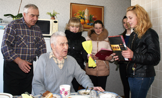 В День рождения всё же старались поменьше грустить и больше вспоминать о хороших событиях в жизни юбиляра, ведь так важно поддерживать в нем бодрость духа и оптимизм! В адрес именинника звучало много добрых слов, в том числе и от молодого поколения – учениц Хоновского учебно-педагогического комплекса, которые заверили ветерана, что будут беречь то, что своей кровью завоевали прадеды и деды, – мир на родной земле и свободу!