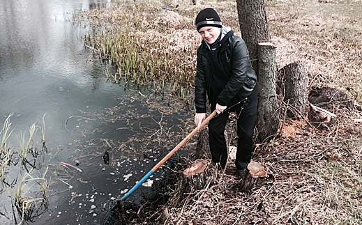 Поделившись на бригады, ребята ловко работали граблями, собирая с поверхности реки и прибрежных зон прошлогоднюю тину. Быстро росли кучи хвороста и сухой старой листвы. Полученным результатом ребята остались очень довольны.
