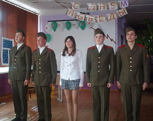 В нашем зале звучали песни, которые бередили душу когда-то и которые будут бередить ее, сколько бы лет ни прошло с момента их создания: «Баллада о солдатской матери» (6 класс), «Бравые солдаты» (2 класс), «Проводы» (3 класс), «О маленьком бара-банщике» (1 класс), «Три танкиста» (4 класс), «Песня пилотов» (9 класс), «Случайный вальс» (8 класс), «Смуглянка» (7 класс), попурри под названием «70 лет назад» (5 класс).