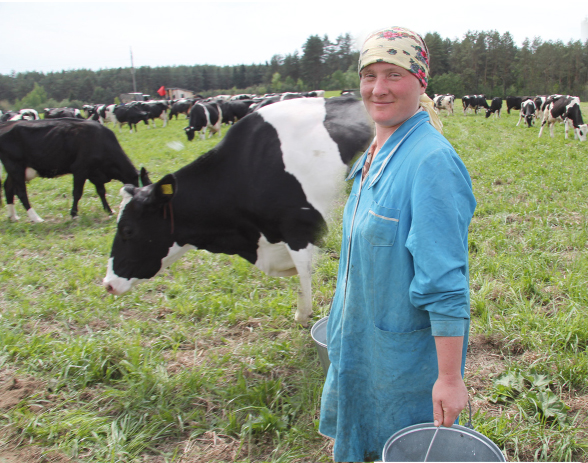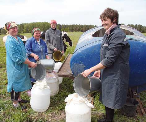 Первая дойка начинается в 5 часов утра. Но опытным дояркам Алесе Шунаевой, Зинаиде Медняковой, Алесе Куксаревой и Елене Клепча к такому режиму не привыкать. Выпас животных посменно осуществляют пастухи-скотники: Николай Шунаев, Юрий Шенцов, Николай Великанов и Наталья Клепча.