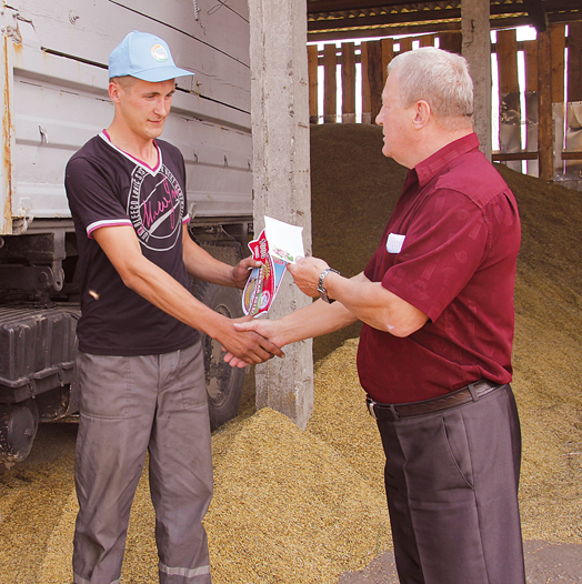 В понедельник председатель райкома профсоюза работников АПК Валерий Розганов поздравил водителя ОАО «Тишовка» Александра Капашилова, который в ходе уборочной кампании на своем автомобиле МАЗ-555142 перевез более тысячи тонн зерна. По традиции, пожелав крепкого здоровья и благополучия, Валерий Иванович вручил передовику благодарность, вымпел лидера, бейсболку с логотипом профсоюза и денежную премию.