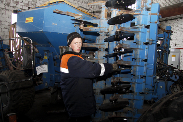 В ремонтной мастерской производит замену дисков на сеялке тракторист-машинист Евгений Рыбочкин. Хотя молодой специалист работает в хозяйстве совсем недавно, по его ловким умелым движениям этого не скажешь.