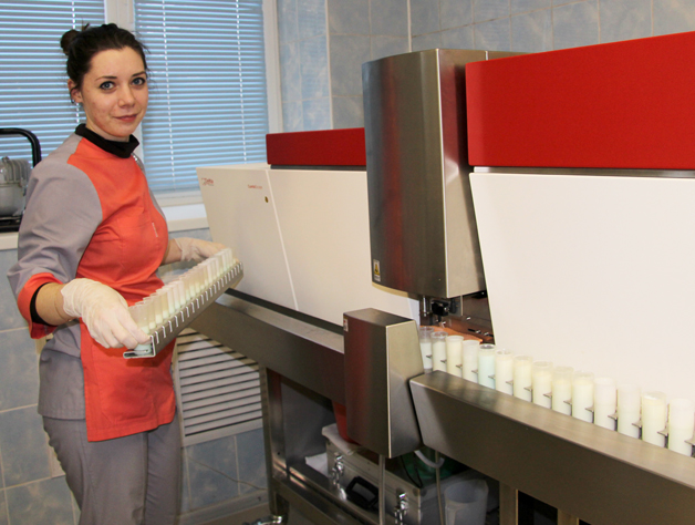 В конце прошлого года в лаборатории установили новый аппарат – анализатор молока Delta. Лаборанты 6-го разряда Ирина Денисенко и Елена Смирнова, подогрев пробирки с молоком до нужной температуры, ставят их на конвейер. «Далее процесс полностью автоматизирован. Полученные данные о молоке поступают на компьютер и обрабатываются в специальной программе. Самостоятельно повлиять на результаты исследований нельзя», – рассказывает лаборант 6-го разряда Анна Прокопченко.