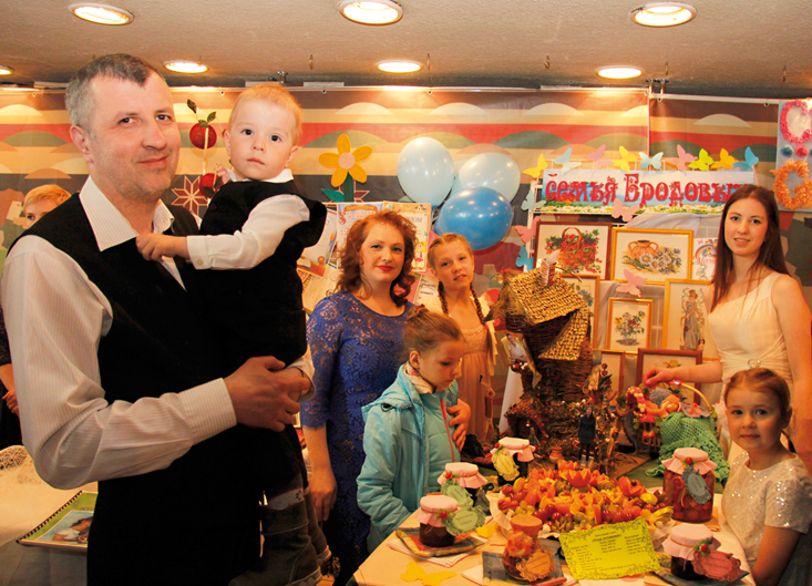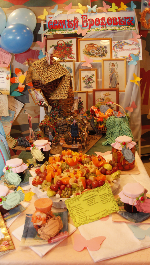 На выставочном столе представителей нашего района – вязаные сувениры, аккуратно сложенные в плетеную корзинку, с любовью вышитые картины – творения хранительницы домашнего очага Елены Владиславовны, изделия из бисера – работа старшей дочери Татьяны. Привлекают внимание проходящих мимо гостей конкурса необычные закатки, приготовленные по собственному рецепту (здесь и соусы, и овощные ассорти, и даже ароматизированные розы!), а также шоколадный пирог «Клад витаминов», по-дизайнерски украшенный фруктовыми нарезками. Что ж, кулинарным способностям команды можно только подивиться! Самое же почетное место на семейной презентации занял выполненный из природного материала много-этажный дом. При его изготовлении в ход пошли лоза, ломаная плитка, солома и шишки. «Это наша визуализация, – комментирует восторженные отзывы глава семейства. – Большой дом – заветная мечта».