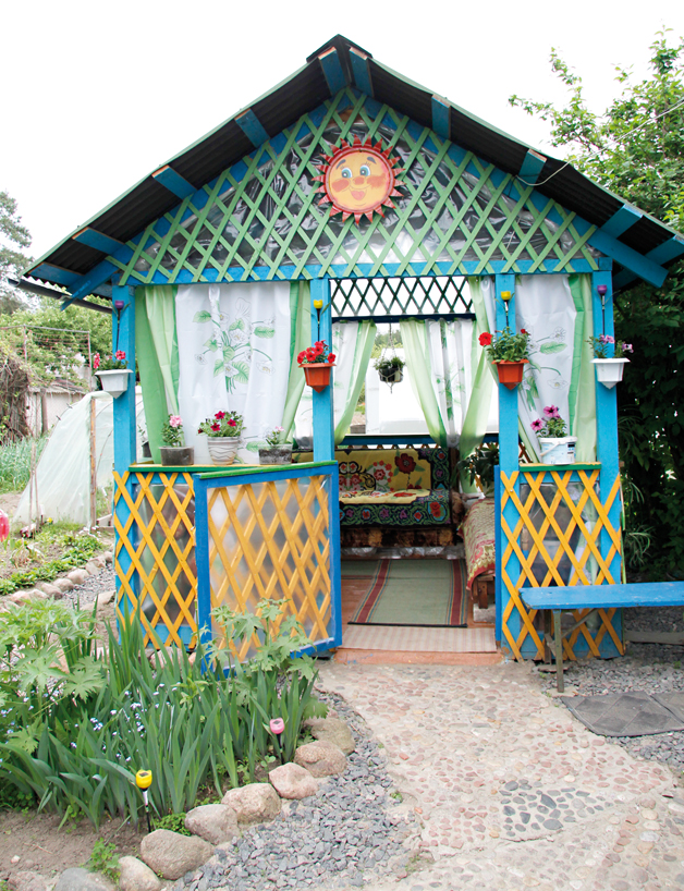 «Пройдемте в беседку», – встречает гостей из редакции хозяйка, вежливо предлагая чашку чая. Деревянная постройка, или, как ее называет наша героиня, личный кабинет, – дело рук мужа и сына. Участок земли затемненный, растения плохо приживались, поэтому у жильцов и возникла идея установить легкое сооружение. Тканевые занавески, диваны со столиком, разноцветные подушки, цветы в вазонах – после обустройства и декорирования садовое строение превратилось в уютное место, где в летний день можно спрятаться от палящего солнца, уединиться для беседы или скрыться от дождя, провести время в тесном кругу семьи.