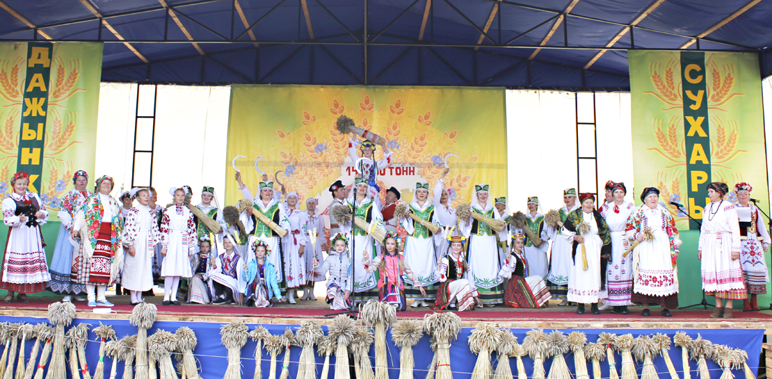 На протяжении всего праздника свои песни дарили творческие коллективы района. Прозвучали зажигательные песни в исполнении фольклорно-этнографической группы «Богач» из Минска, которой руководит уроженец аг.Сухари Виктор Воронин. Работали торговые ряды, выставки декоративно-прикладного искусства, даров осени и др.