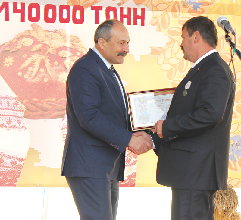 Тепло поблагодарил хлеборобов за труд заместитель министра сельского хозяйства Республики Беларусь Владимир Гаркун. Передовикам жатвы были вручены Почетные грамоты министерства.