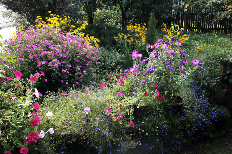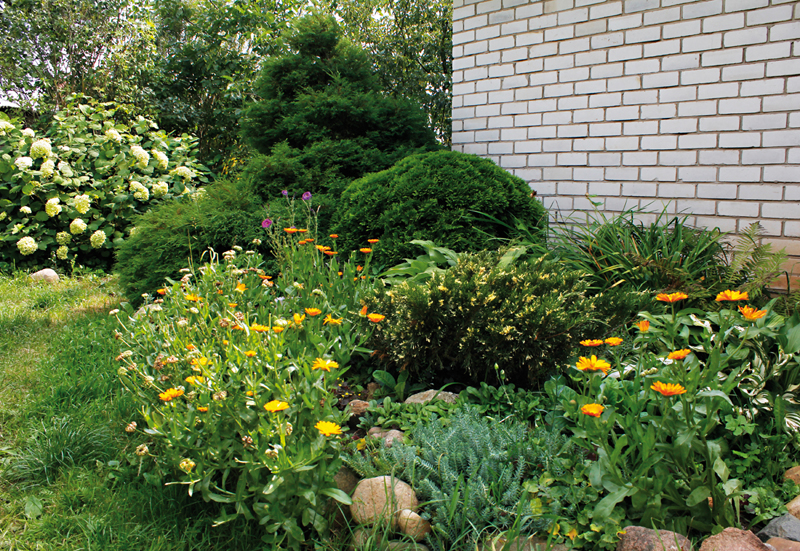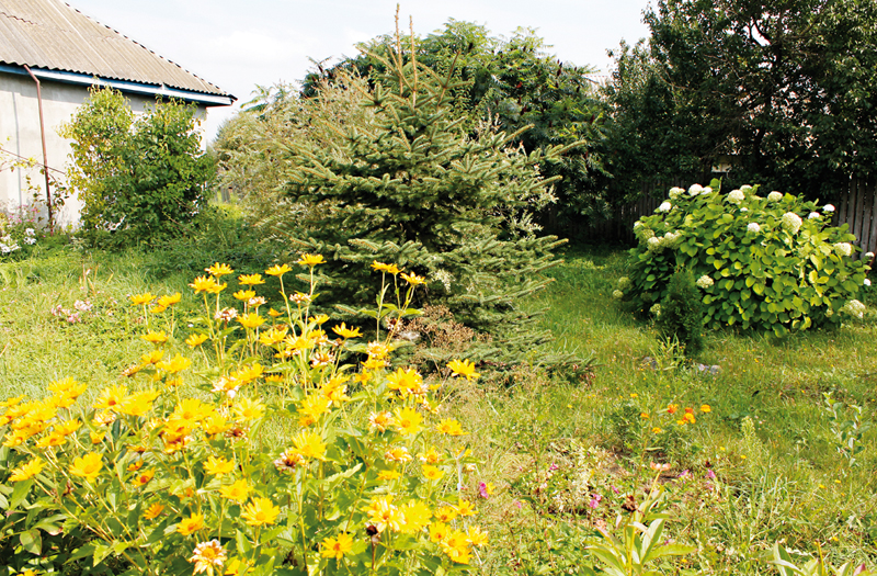 Но все равно вся придомовая территория в зелени. С ранней весны до поздней осени цветы и декоративные растения являются украшением подворья. Первыми зацветают подснежники, затем появляются тюльпаны, нарциссы. А вообще на участке есть лилейники, ирисы, розы, ломбелия, георгины, колокольчики, герберы. Кроме цветов на участке радуют глаз хвойные деревья, декоративные кустарники, среди которых и дёрен. На территории за воротами также высажены цветы. За всем этим — кропотливый труд хозяйки.