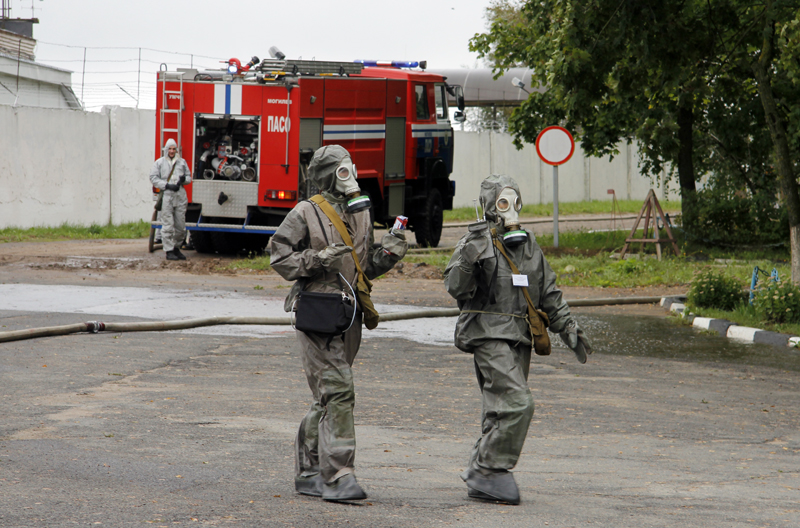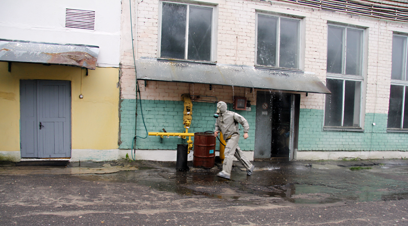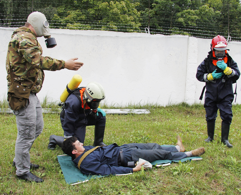 На химически опасном объекте ОАО «Агрокомбинат «Восход» произошла утечка аммиака (условно). После сигнала о чрезвычайном происшествии на место прибыли машины спасателей МЧС, скорая медицинская помощь, скорая помощь МЧС, сотрудники центра гигиены и эпидемиологии и других служб, обеспечивающих жизнедеятельность региона. Работники предприятия в срочном порядке были эвакуированы из очага, пораженного аммиаком. Для этих целей применялись специальные костюмы и противогазы. Пострадавшие были вынесены из опасного места, им оказана медицинская помощь. Сотрудники МЧС, применяя специальные средства и технику, в кратчайшие сроки ликвидировали очаг поражения. К условной аварии подключились службы по восстановлению из числа специалистов ОАО «Агрокомбинат «Восход». Сотрудниками зонального центра гигиены и эпидемиологии своевременно были проведены замеры воздуха с целью выявления паров аммиака. Такие слаженные действия помогли обеспечить ликвидацию аварии, а главное — обезопасить людей.