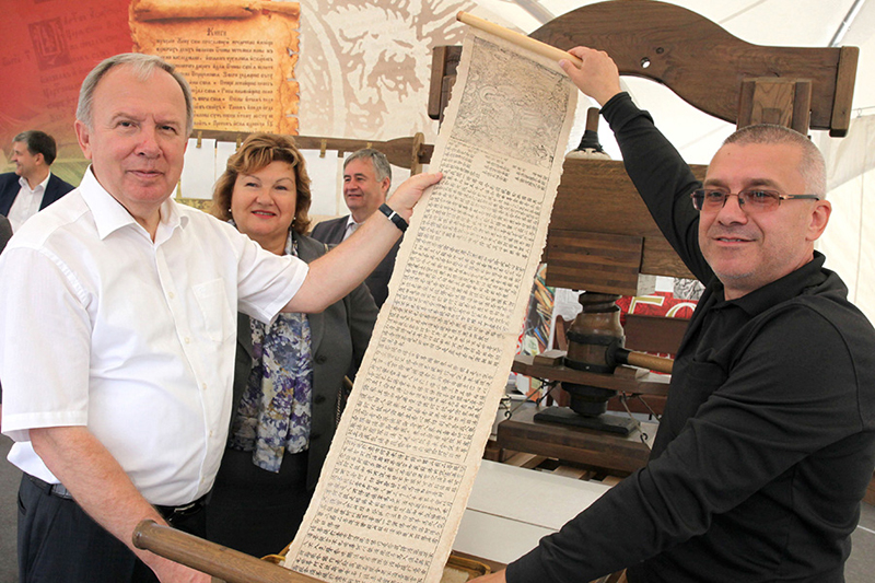 От книги старинной — к книге современной. Дело Скорины продолжил традиционный Фестиваль книги и прессы, собравший на площади имени первопечатника крупнейшие издательства нашей страны. В путешествие по вехам становления белорусской истории, культуры, литературы и духовности нашего народа приглашали издатели, писатели, поэты и публицисты… Рядом с павильоном «Советской Белоруссии» все дни рокотал печатный станок XVI века, в мельчайших подробностях воссозданный историком и коллекционером Владимиром Лиходедовым. Напечатать на станке свою собственную страничку могли все желающие — Владимир Алексеевич с удовольствием предоставил такую возможность: