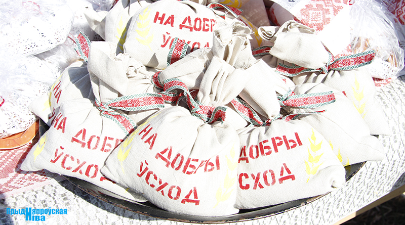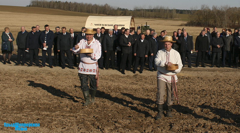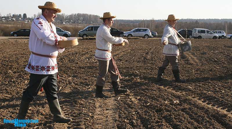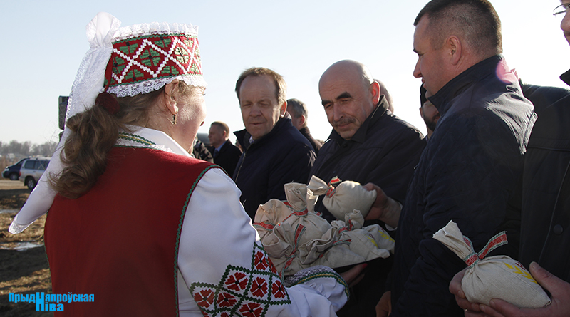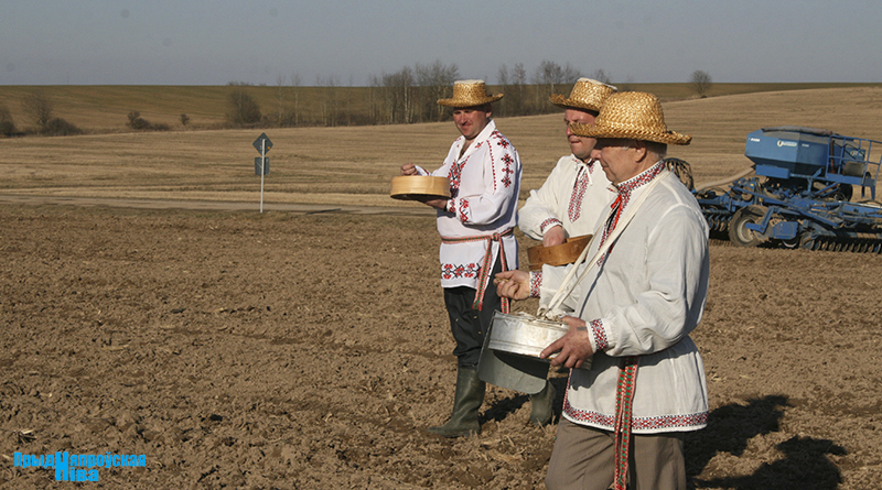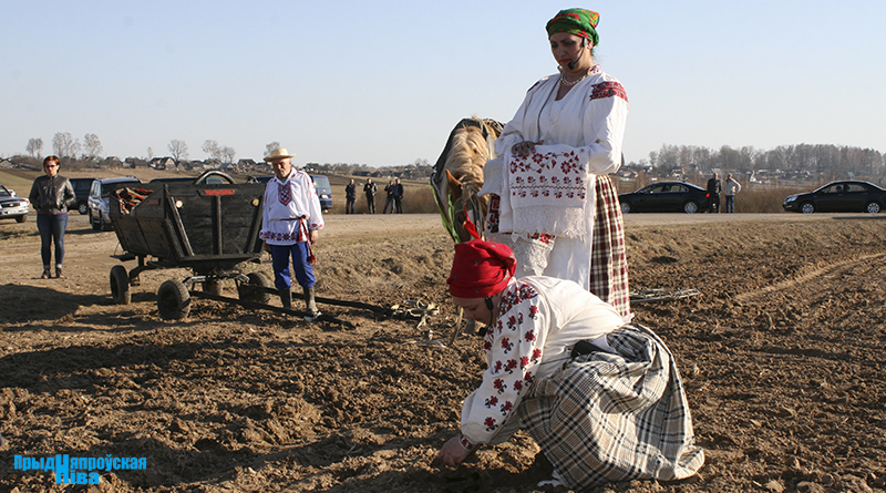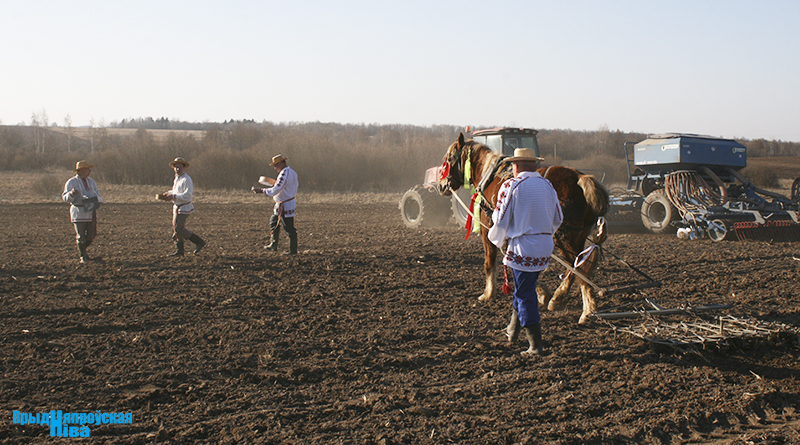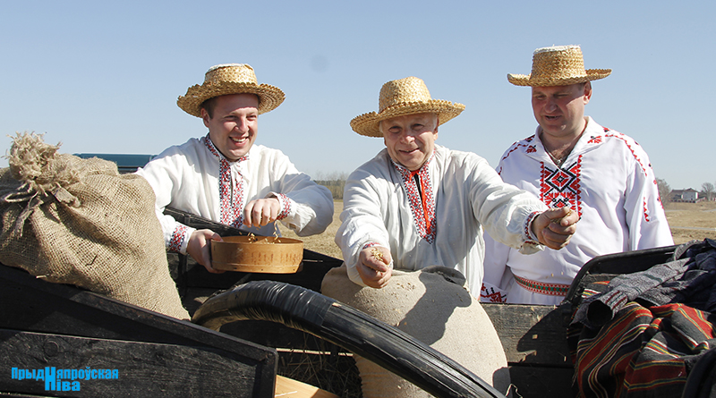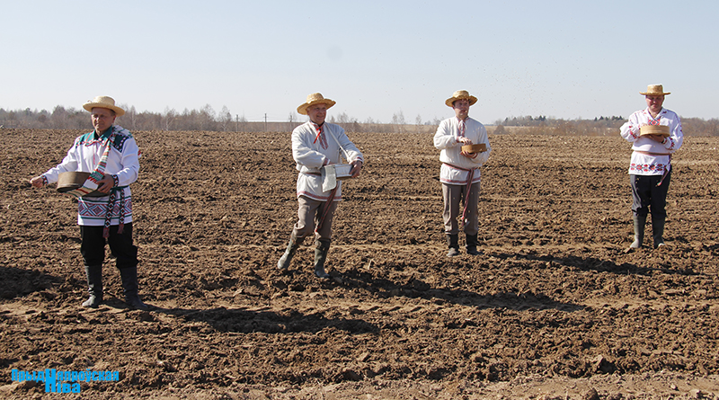 «Так засявайце ж нівы, людзі! Зямля-матуля, зерне ты прымай!» – звучат голоса работников культуры, и, наконец, наступает время для самого обряда. Празднично одетые женщины закопали в землю горшочек с пшенной кашей – на ровные и сильные всходы, как считали наши предки. А «гаспадары», нарядившись в чистые льняные рубахи, подпоясавшись красными самоткаными поясами, не забыв и про соломенные шляпы, вышли в поле, где по старинке посеяли зерно, разбрасывая его горстями из лукошек. Первую борозду вспахали при помощи плуга и лошади, после чего был дан старт машинному труду.