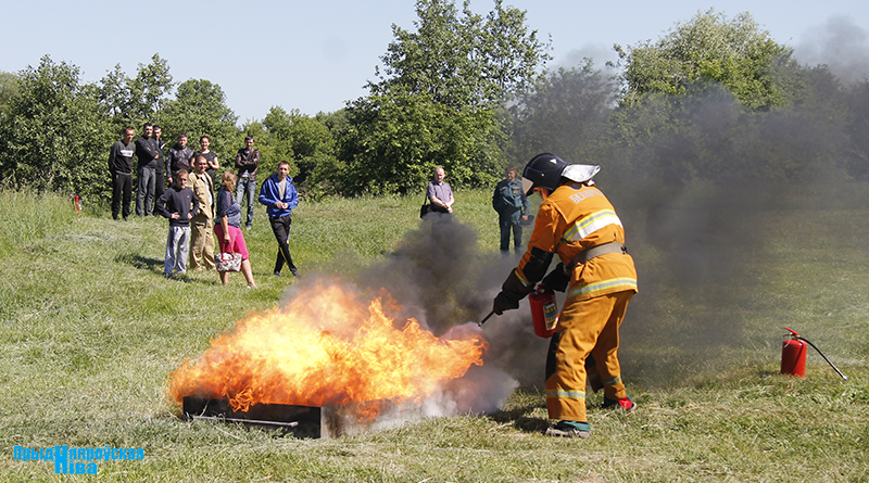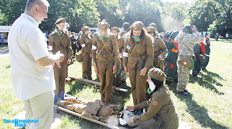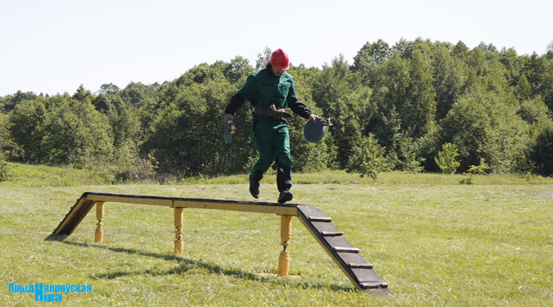 Пока работницы сельхозпредприятий и организаций демонстрировали свои знания и навыки в области оказания первой медицинской помощи, мужчины соревновались на полосе препятствий, состоящей из четырех этапов. Эстафетной палочкой служил пожарный ствол. По условиям соревнований, первый участник бежал стометровку, второй преодолевал забор, третий двигался по бревну с пожарными рукавами, соединяя их между собой и разветвлением. На завершающем этапе четвертый участник с помощью огнетушителя заливал горящую жидкость. Все добровольные пожарные дружины показали хорошее время прохождения эстафеты и согласованность действий. Кроме участия в основных этапах соревнований командам предоставлена возможность проявить себя в дополнительных конкурсах, тематической викторине районной организации Белорусского Общества Красного Креста.