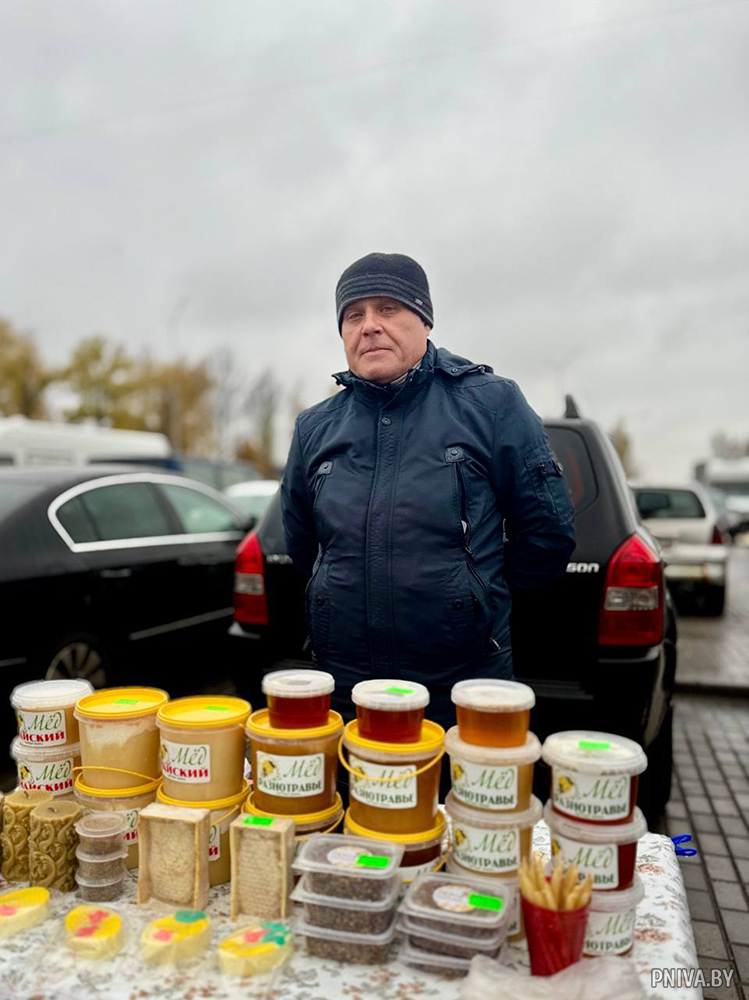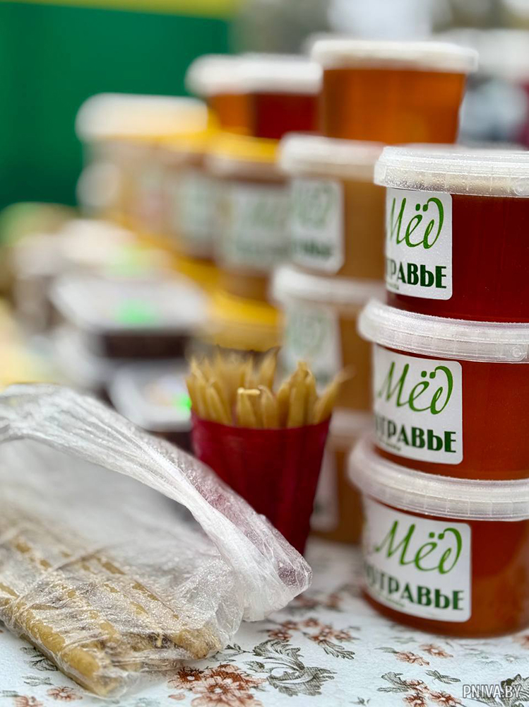Пчеловод Михаил Зубарев приехал из деревни Машенаки Мостокского сельсовета. На его столе стояли душистый мед, натуральные восковые свечи и другие продукты пчеловодства. Каждая баночка была результатом кропотливого труда и любви к своему делу, которому он посвящает все свои силы.