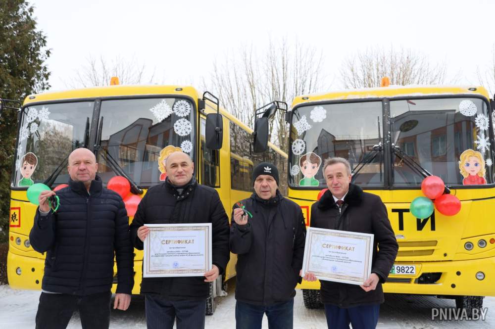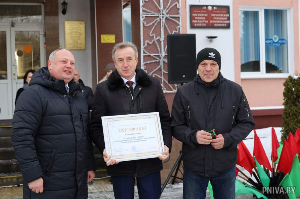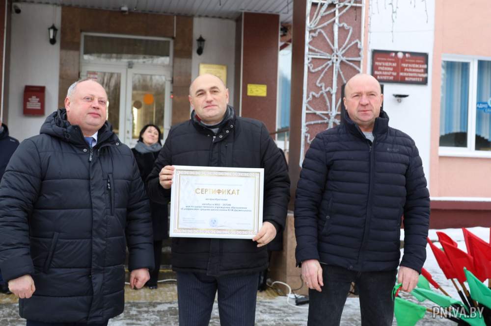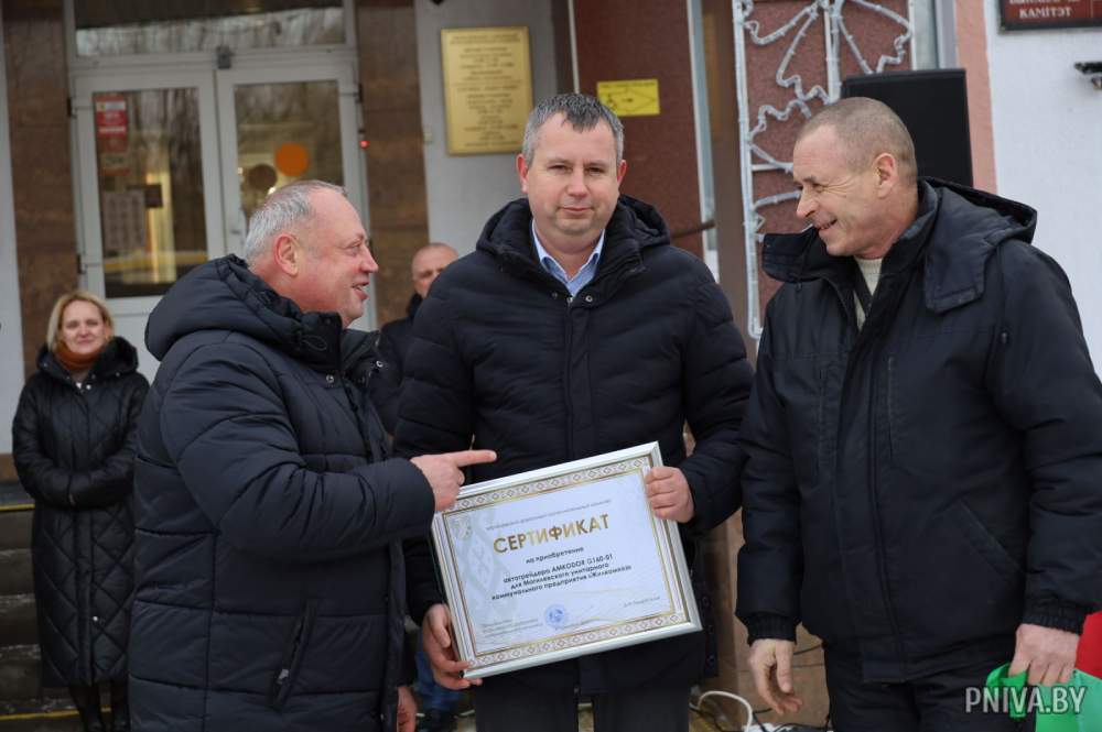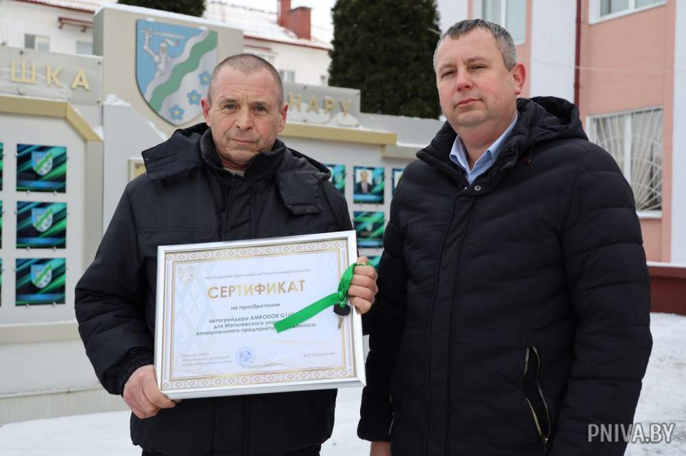 В Могилевском районе существует традиция – в преддверии Нового года вручать подарки организациям, представляющим самые разные сферы деятельности. Вот и в последний день уходящего года возле административного здания Могилевского райисполкома в торжественной обстановке состоялось вручение сертификатов на два школьных автобуса для учащихся Княжицкой средней школы и Сухаревской средней школы имени Ю.М. Двужильного и на автогрейдер «Амкодор G160-01» для МУКП «Жилкомхоз». А также были вручены ключи от арендной квартиры молодой семье Королевых, которые успешно трудятся в сфере культуры.