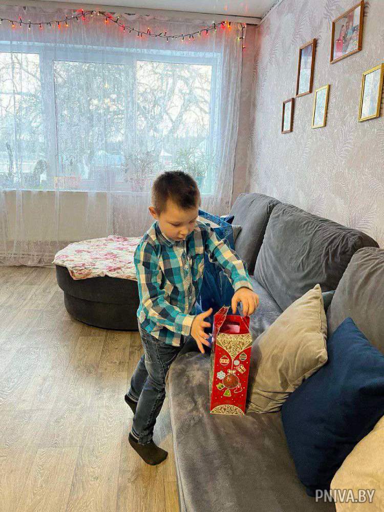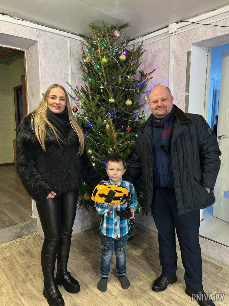 Принимали подарки и ребята из деревни Вильчицы. Директор ООО «СМУ-Вертикаль» Денис Устинович и ведущий инженер Анна Борисенко по поручению учредителя предприятия Бронислава Ваксмана поздравили с новогодними праздниками 6-летнего Арсения.