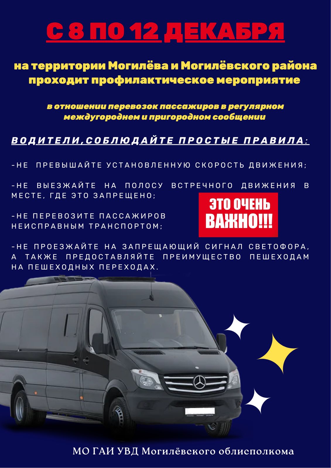 С 8 по 12 декабря на территории Могилева и Могилевского района Госавтоинспекция проводит комплекс профилактических мероприятий, направленных на повышение безопасности перевозок пассажиров маршрутными микроавтобусами.