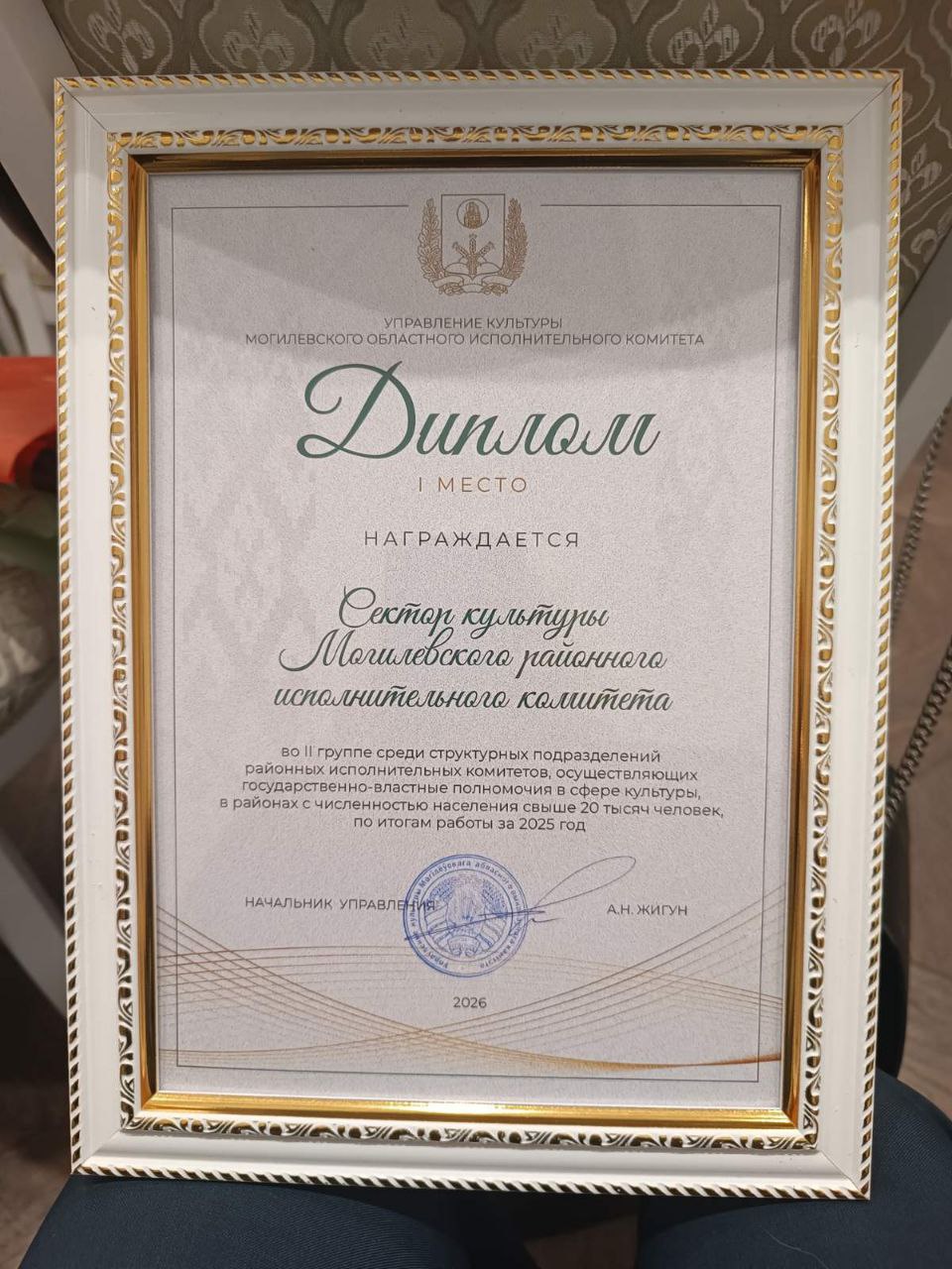 Александр Жигун отметил высокий уровень профессионализма всех творческих коллективов и работников учреждений, представляющих сферу культуры Могилевского района, и вручил Диплом за победу заведующему сектором культуры Наталье Гомоновой.
