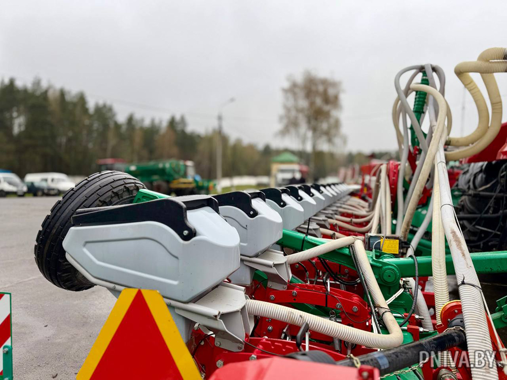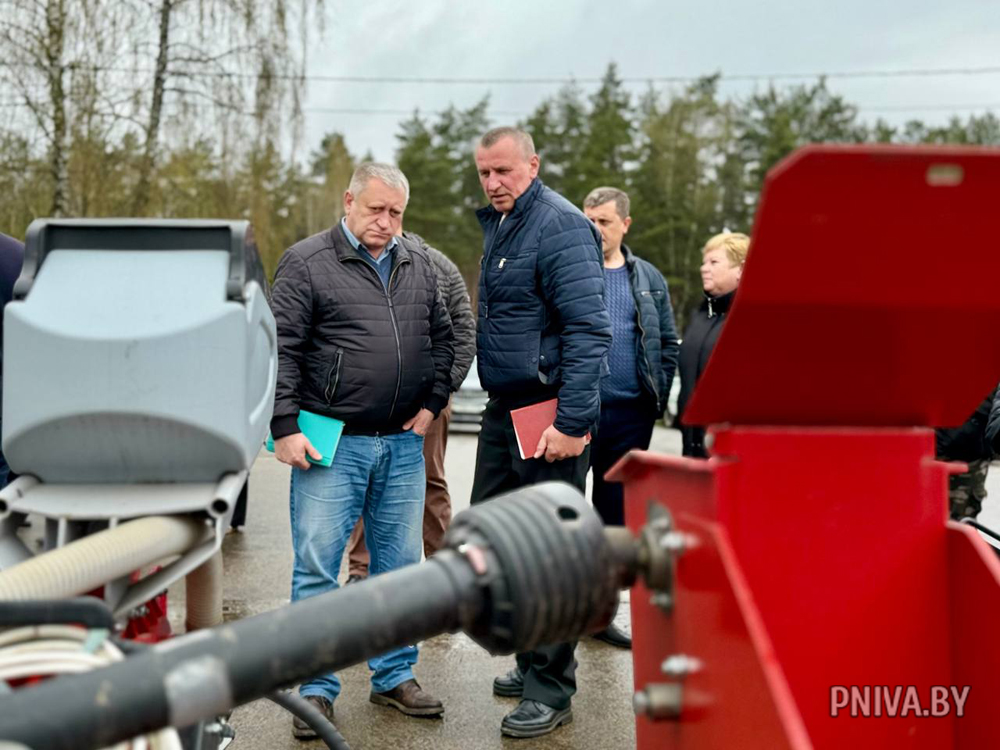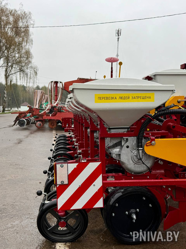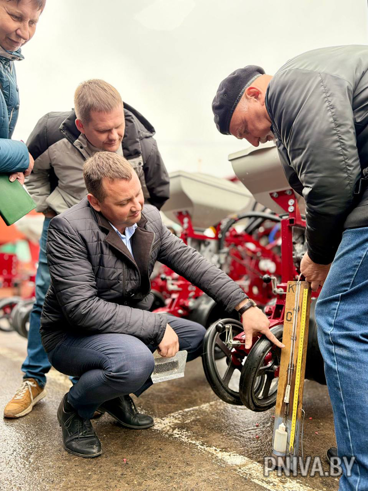 В центре внимания оказались сеялки, подготовленные к выходу в поле. Яков Яроцкий вместе с инженерами и агрономами хозяйств обошел каждый агрегат, обращая внимание на узлы, от которых напрямую зависит качество будущего сева. Присутствующие получили возможность не просто посмотреть со стороны, а вплотную подойти к технике, заглянуть в высевающие аппараты, проверить настройку сошников и прикатывающих катков.